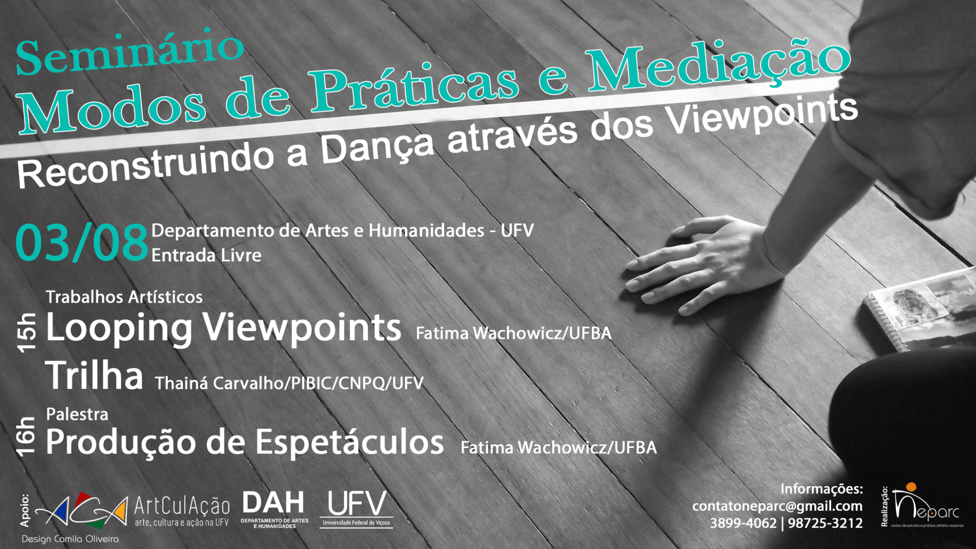 O Seminário Modos de Práticas e Mediação nas artes da Performance/Dança, tratou da Reconstrução da Dança através dos Viewpoints. Tendo como convidada especial a performer e pesquisadora em Dança Fátima Wachowicz (UFBA). A programação foi composta por palestra e apresentações artísticas de Fátima Wachowicz e Thainá Carvalho. Confira um pouco do que foi esse encontro!