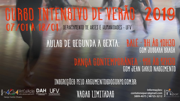 Aconteceu de 07 a 25 de janeiro, no Departamento de Artes e Humanidades da UFV, o Curso Intensivo de Verão 2019 com aulas de Balé Clássico e Dança Contemporânea. Destinado a artistas, pesquisadores e comunidade em geral a atividade é oferecida pelo NEPARC – Núcleo de Estudos e Práticas Artístico-Corporais coordenado pela professora Andrea Bergallo … Continue lendo Curso intensivo de verão 2019
